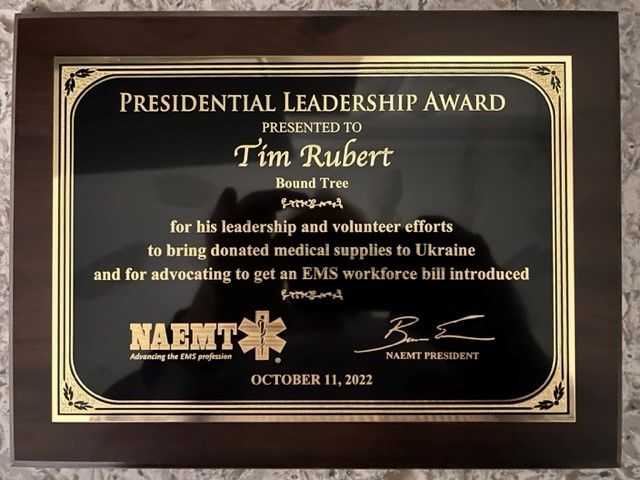 ORLANDO — The National Association of Emergency Medical Technicians awarded Tim Rubert, associate vice president of government affairs at Bound Tree Medical , with the 2022 Presidential Leadership Award on Oct. 11 during NAEMT’s general membership meeting at the EMS World Expo .