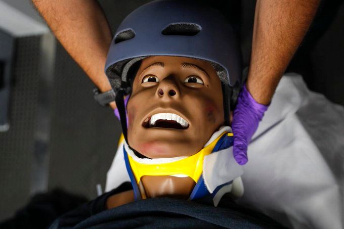 The patients in these scenarios are high-tech mannequins programmed to react to the actions of the first responders. SIM-IA technicians sit in a separate part of the truck during the training and control how the patients, and their vital signs, react to the choices trainees make.